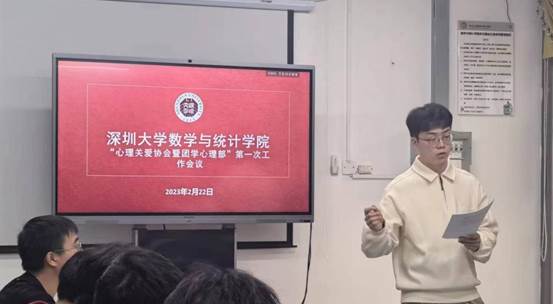 2023年2月22日,数学与统计学院心理关爱协会暨团学心理部新学期第一次工作会议在汇星楼501召开,参加会议的有学院党委副书记张国强,辅导员韩芳丹、肖晓君、孙毅翀、钟晓姗、张择梓,学院2+3辅导员田力帆、学院“心协”和学院团学“心理部”全体成员。